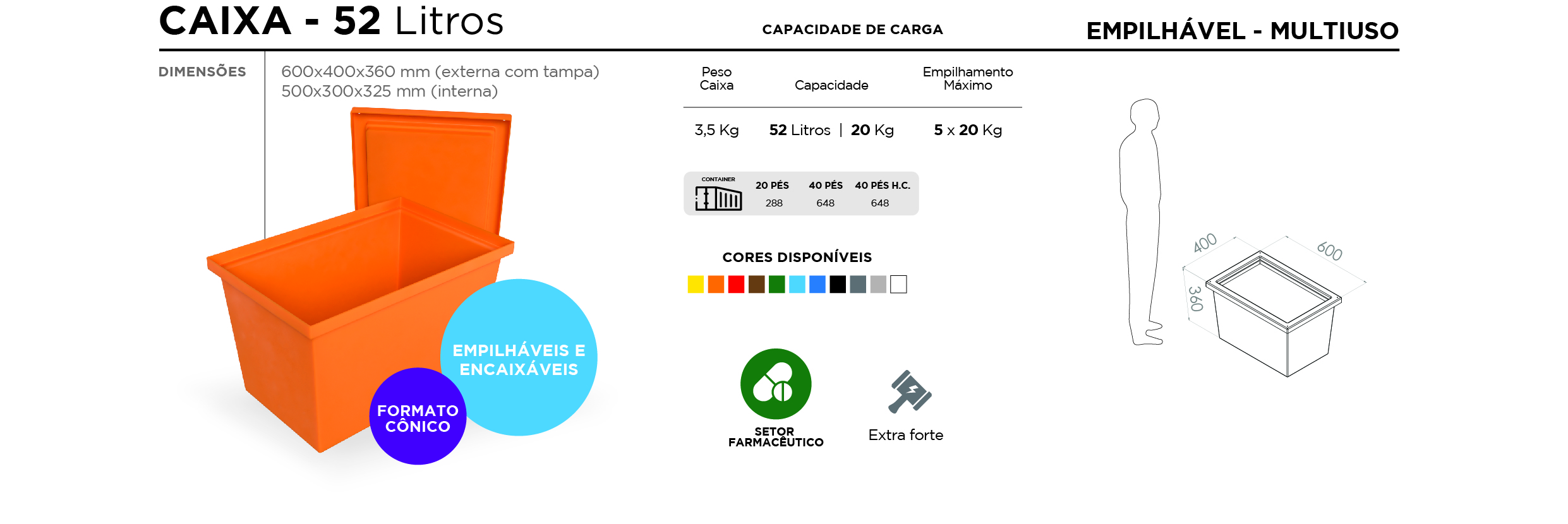 Empilháveis, são produtos extremamente robustos, fáceis de higienizar e livres de manutenção. Não danificam o piso da fabrica. Produzidos em diversas cores e nas versões de 38 a 950 litros, com capacidades de carga que variam de 30 kg até 1000 kg.