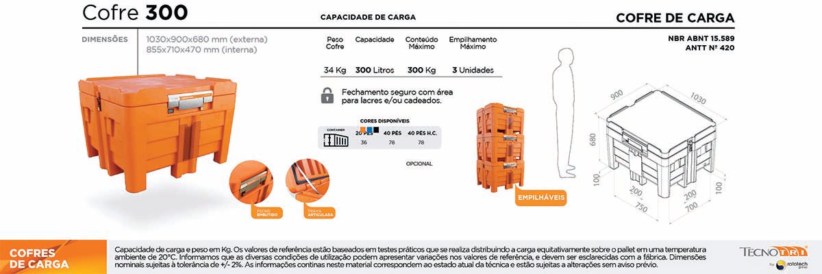 Altamente resistente e imune a agentes químicos. O Cofre de Carga Tecnotri possuí fechos de Inox e alça na tampa, que garantem o fechamento seguro do cofre durante o transporte da carga. Em casos de vazamentos ou derramamentos, não ocorre a contaminação do ambiente nem de outros produtos, pois o material perigoso fica totalmente retido no interior do cofre.