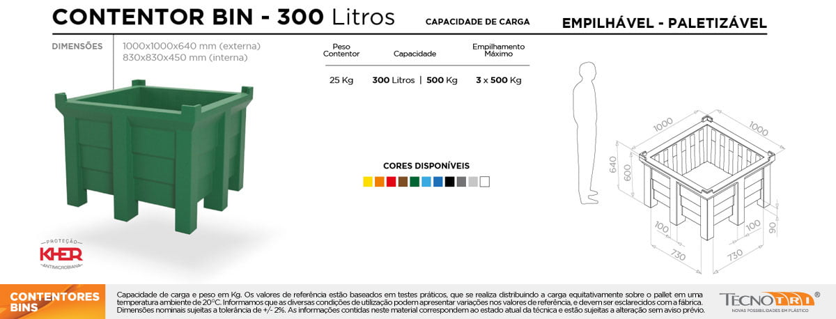 Empilháveis, são produtos extremamente robustos, fáceis de higienizar e livres de manutenção. Não danificam o piso da fabrica. Produzidos em diversas cores e nas versões de 38 a 950 litros, com capacidades de carga que variam de 30 kg até 1000 kg.