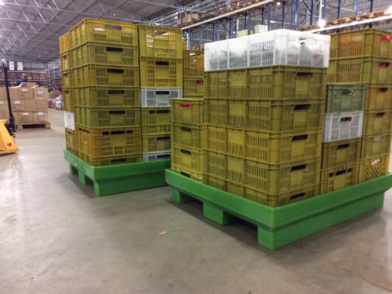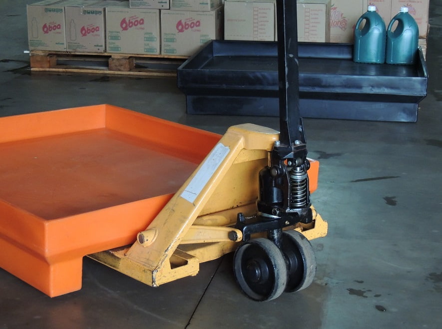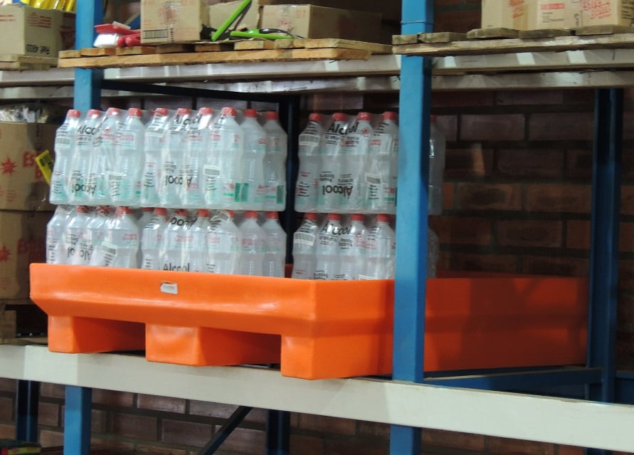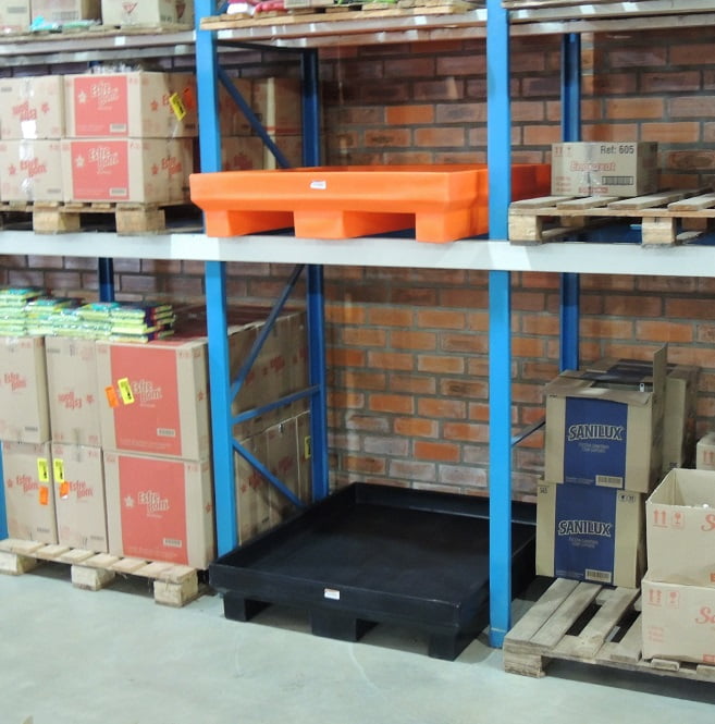 Pallet de contenção ou pallet contentor. Utilizado para assegurar a contenção de vazamentos. Sua principal função é impedir que líquidos químicos, inflamáveis, ácidos e corrosivos que vazem dos tambores contaminem o solo o ambiente e as pessoas.
