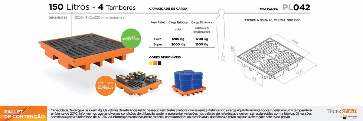 O pallet de contenção, também chamado de dique de contenção e bacia de contenção, possui diferentes formatos e modelos para 1 tambor, 2 tambores e 4 tambores com capacidades variadas de 100L até 1.000L.