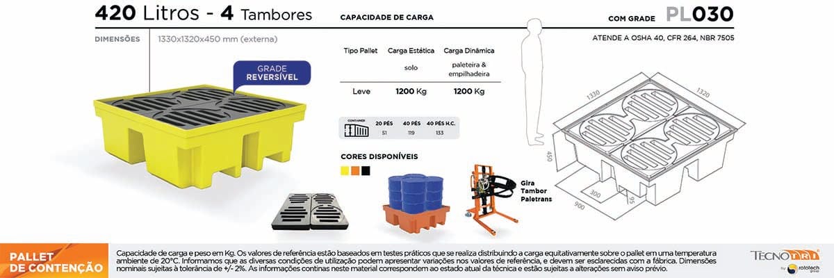 Pallet de contenção para 4 tambores ou pallet contentor, como também é chamado, é utilizado para assegurar a contenção de vazamentos, impedindo que líquidos químicos, inflamáveis, ácidos e corrosivos que eventualmente vazem dos tambores, acabem contaminando o solo, o ambiente e as pessoas