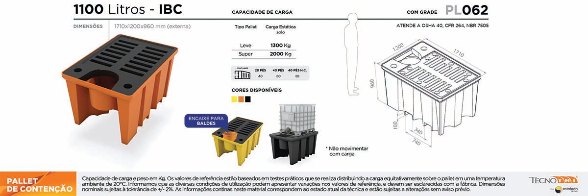 O pallet de contenção 1100 litros ou pallet contentor, como também é chamado, é utilizado para assegurar a contenção de vazamentos de líquidos químicos, inflamáveis, ácidos e corrosivos, oriundos dos tambores. Assim, o pallet armazena o líquido vazado e evita a contaminação do solo, do ambiente e das pessoas ao redor.