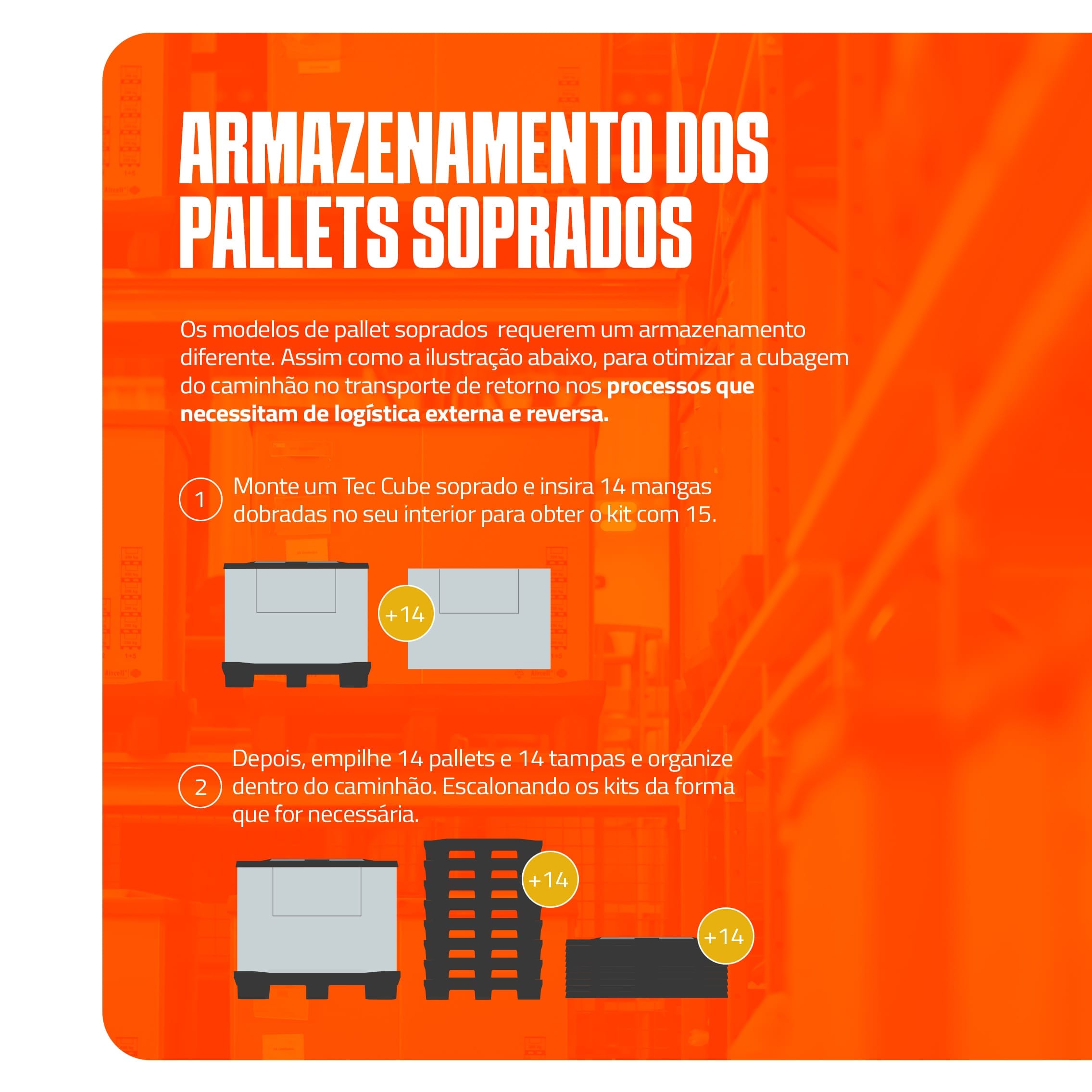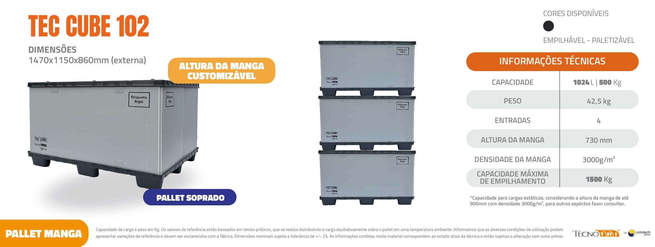 O Pallet Manga TecCube, também conhecido como manga pallet, caixa pallet ou pallet unitizado é muito usado para unificar cargas segmentadas em um mesmo agrupamento de volume. Possui duas opções, em pallet injetado ou soprado. Sua manga é desenvolvida com tecnologia “bubble” proporcionando maior resistência das “paredes” da caixa. Pondendo a altura ser personalizada de acordo com a sua necessidade.
