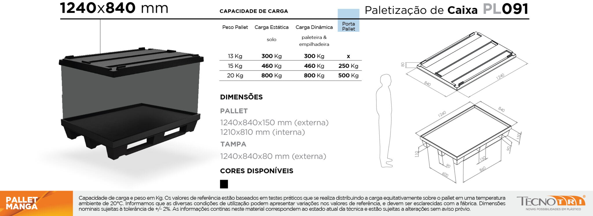 • 1240 x 840 x 150 mm (externa) – Pallet 1210 x 810 (interna)