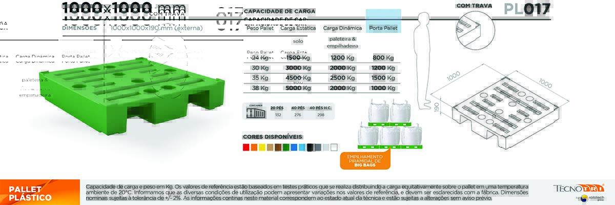 A Tecnotri possui mais de 90 modelos de Pallets de plástico, em tamanhos e cores diversas. Se preferir, podemos desenvolver o pallet perfeito para se enquadrar na sua empresa. Temos uma equipe de engenheiros 100% preparada para desenvolver projetos especiais e personalizados.
