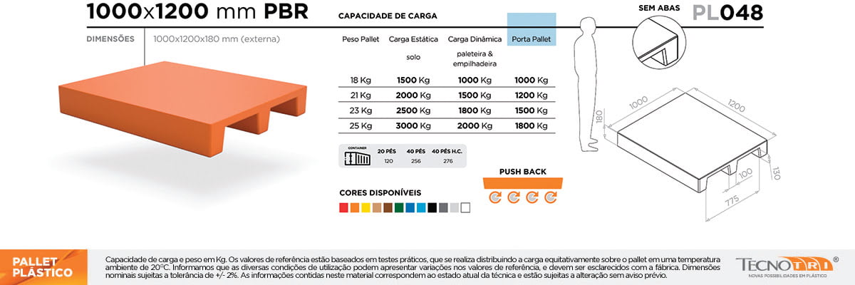 Um fator muito importante na escolha do Pallet Plástico é a capacidade de carga. Existem dois tipos de cargas a serem consideradas a Carga Dinâmica (carga suportada quando o pallet está em movimento na paleteira ou empilhadeira) e a Carga Estática, (carga suportada quando o pallet está apoiado no solo). Uma terceira variante é a capacidade de carga em relação ao sistema de armazenagem que pode ser em Porta Pallet, Drive in e Rack. Veja nas informações técnicas abaixo as capacidades de carga e escolha o pallet ideal para o seu negócio.