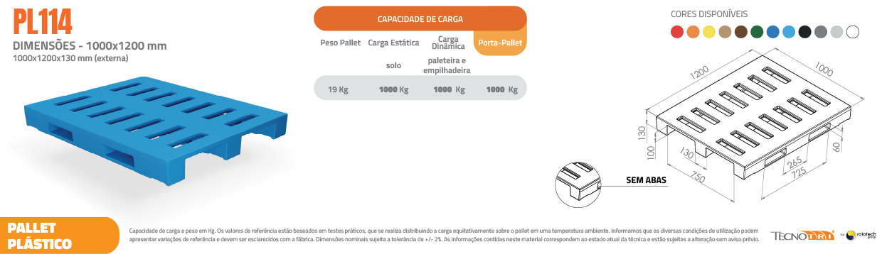 Um fator muito importante na escolha do Pallet Plástico é a capacidade de carga. Existem dois tipos de cargas a serem consideradas a Carga Dinâmica (carga suportada quando o pallet está em movimento na paleteira ou empilhadeira) e a Carga Estática, (carga suportada quando o pallet está apoiado no solo). Uma terceira variante é a capacidade de carga em relação ao sistema de armazenagem que pode ser em Porta Pallet, Drive in e Rack. Veja nas informações técnicas abaixo as capacidades de carga e escolha o pallet ideal para o seu negócio.