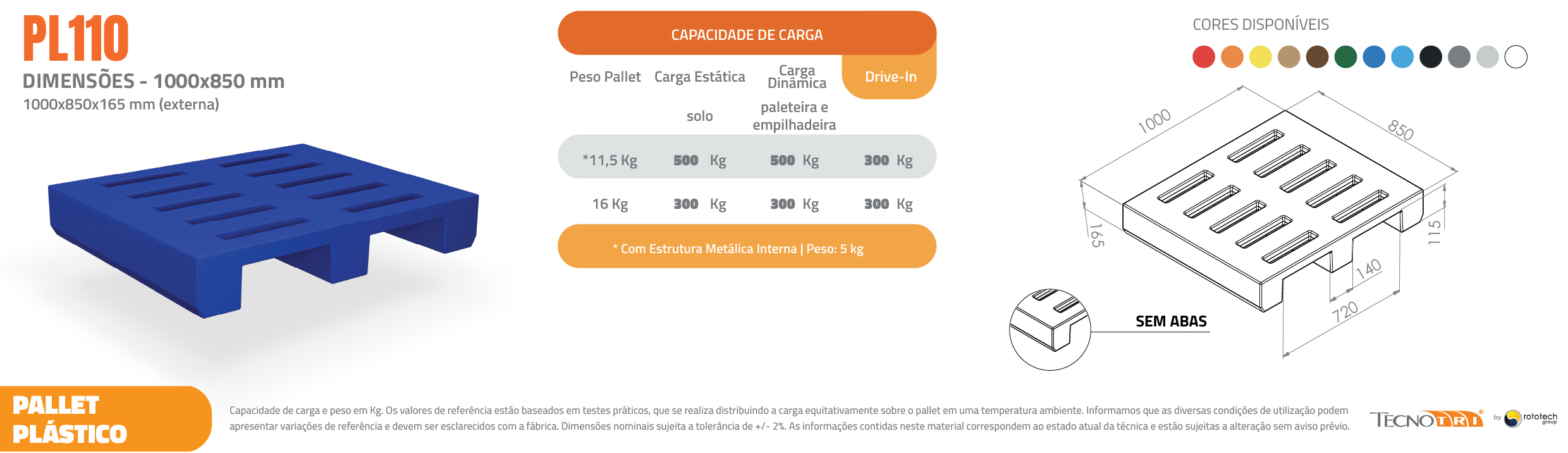 Um fator muito importante na escolha do Pallet Plástico é a capacidade de carga. Existem dois tipos de cargas a serem consideradas a Carga Dinâmica (carga suportada quando o pallet está em movimento na paleteira ou empilhadeira) e a Carga Estática, (carga suportada quando o pallet está apoiado no solo). Uma terceira variante é a capacidade de carga em relação ao sistema de armazenagem que pode ser em Porta Pallet, Drive in e Rack. Veja nas informações técnicas abaixo as capacidades de carga e escolha o pallet ideal para o seu negócio.