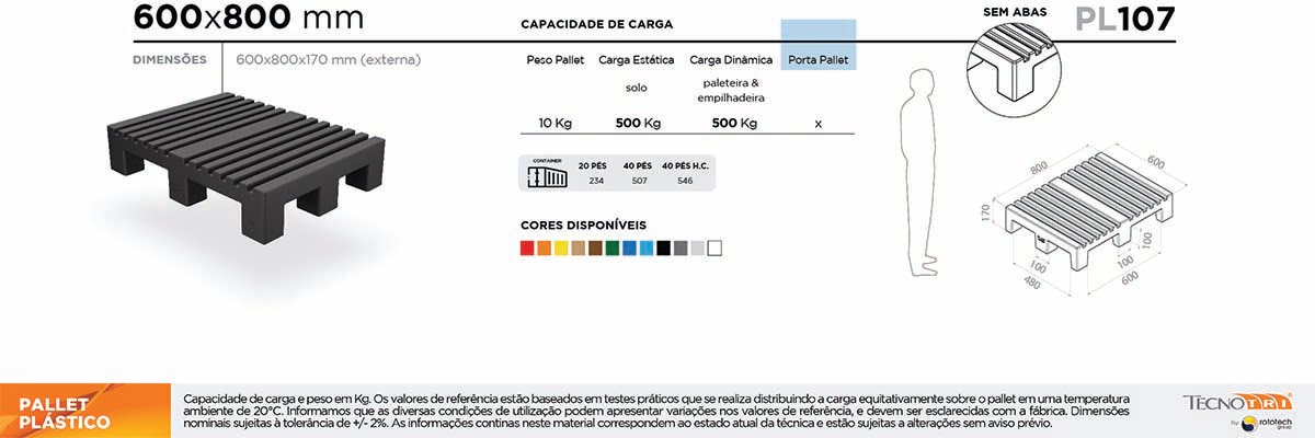 Um fator muito importante na escolha do Pallet Plástico é a capacidade de carga. Existem dois tipos de cargas a serem consideradas a Carga Dinâmica (carga suportada quando o pallet está em movimento na paleteira ou empilhadeira) e a Carga Estática, (carga suportada quando o pallet está apoiado no solo). Uma terceira variante é a capacidade de carga em relação ao sistema de armazenagem que pode ser em Porta Pallet, Drive in e Rack. Veja nas informações técnicas abaixo as capacidades de carga e escolha o pallet ideal para o seu negócio.