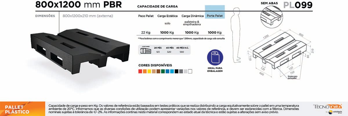 Um fator muito importante na escolha do Pallet Plástico é a capacidade de carga. Existem dois tipos de cargas a serem consideradas a Carga Dinâmica (carga suportada quando o pallet está em movimento na paleteira ou empilhadeira) e a Carga Estática, (carga suportada quando o pallet está apoiado no solo). Uma terceira variante é a capacidade de carga em relação ao sistema de armazenagem que pode ser em Porta Pallet, Drive in e Rack. Veja nas informações técnicas abaixo as capacidades de carga e escolha o pallet ideal para o seu negócio.